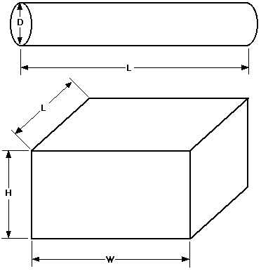 In this format X, Y, and Z are the height, width, and length in inches. The slashes separate the dimensions, and the pluses bound the dimensions. A dimension of D indicates a diameter which is also given in a number of inches. Note that If the dimension in question is less than five feet then it is given in inches. If the dimension is five feet or more then that dimension is given in feet; as indicated with the foot mark '. Below are some graphic illustrations which may help you better visualize how these dimensions are applied.