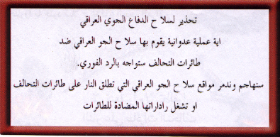 Back of leaflet: (English translation) Attention Iraqi Air Defense. Any hostile action by Iraqi air defenses toward coalition aircraft will be answered by immediate retaliation. Iraqi air defense positions which fire on coalition aircraft or activate air defense radar will be attacked and destroyed.