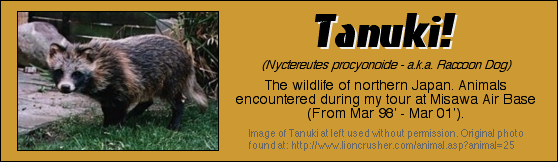 There are numerous species of endangered birds on the base, including many birds of prey. I've seen colorful pheasants (kiji) alongside the roads, and graceful cranes stalking the shores of the lake. Aside from birds, there are also plenty of ground bound critters on the base. I have often seen fox running to and fro. Dashing across roads, and through the fields. My favorite encounter occurred one day when I decided to walk to work. It was rather early, and I was walking along the road. I was in a rather marshy area between two lakes. The morning mist was barely lifting when I heard a soft scuttling noise. I stopped to listen and saw an animal emerge from the underbrush. It wore a mottled coat with hues of red, black and brown. It's eyes were dark and small, and it had a short dog like snout. Tanuki! I was lucky enough to see Tanuki (Raccoon Dog) in the wild. He had a small vole, mole, mouse thing in his mouth, and he seemed not to notice me at all. About half way across the road he stopped, lifted his head and turned to look at me. He nodded his head slightly, then turned to continue on his way. He did not speed away in haste, but kept a leisurely pace. I watched as he left the road, and scuttled into the brush on the opposite side of the road. The rest of the day was a blur, I kept returning to the Tanuki's glance, the nod of his head, that brief but wonderful, chance encounter on the way work.